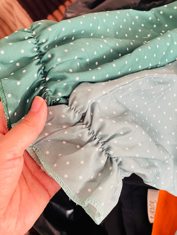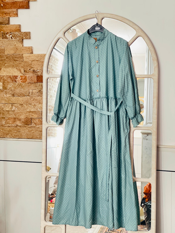 پیراهن کمربند دار که داخل کمر چین سوزنی دارد و آستین ها کش دوزی کار شده است و جلو کار دکمه میخورد